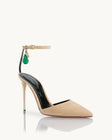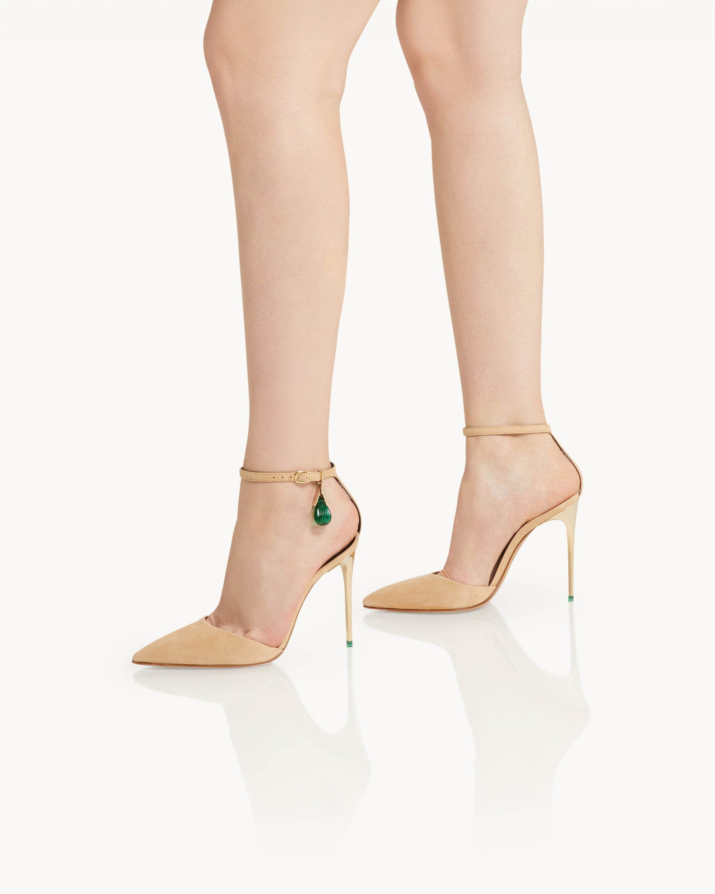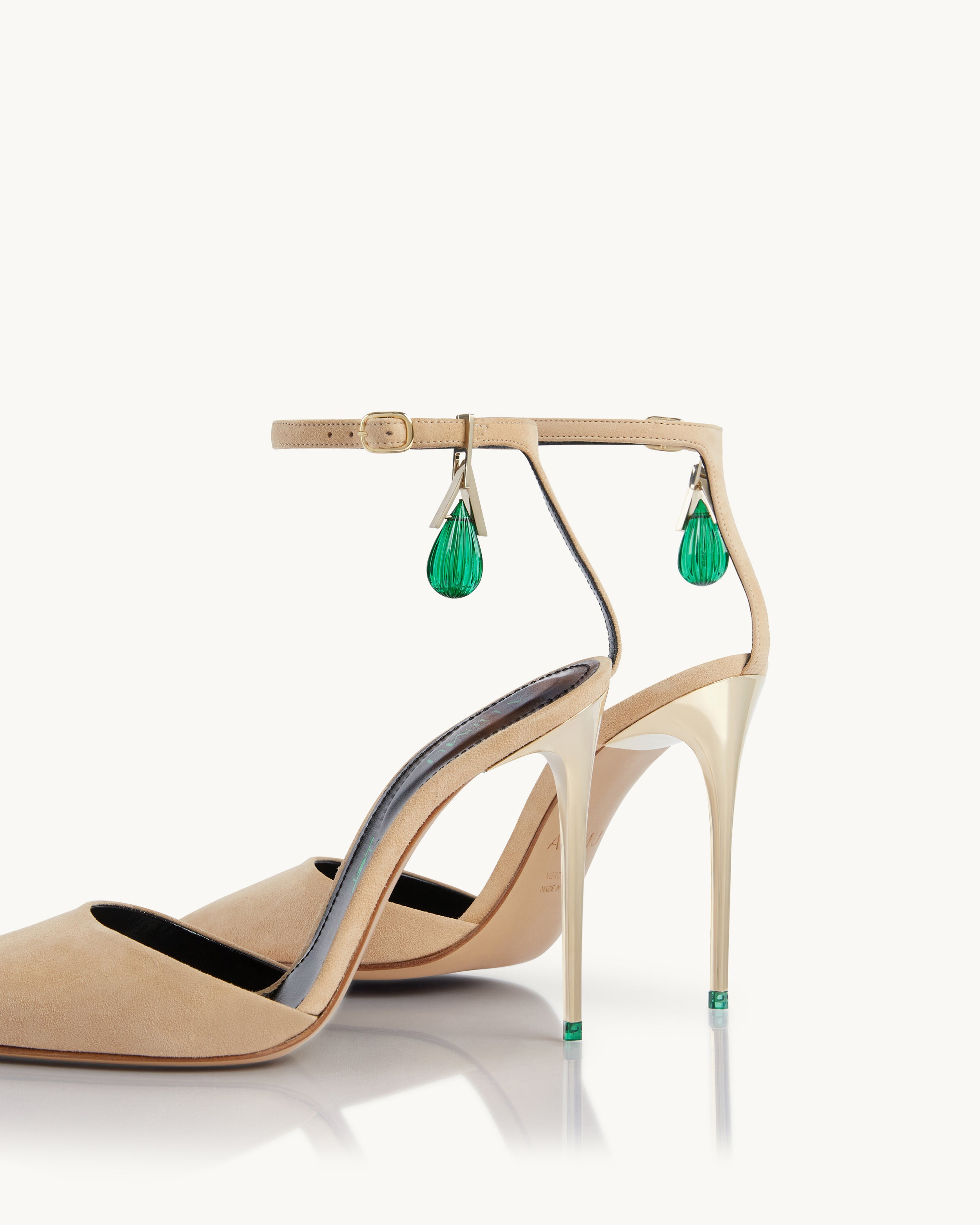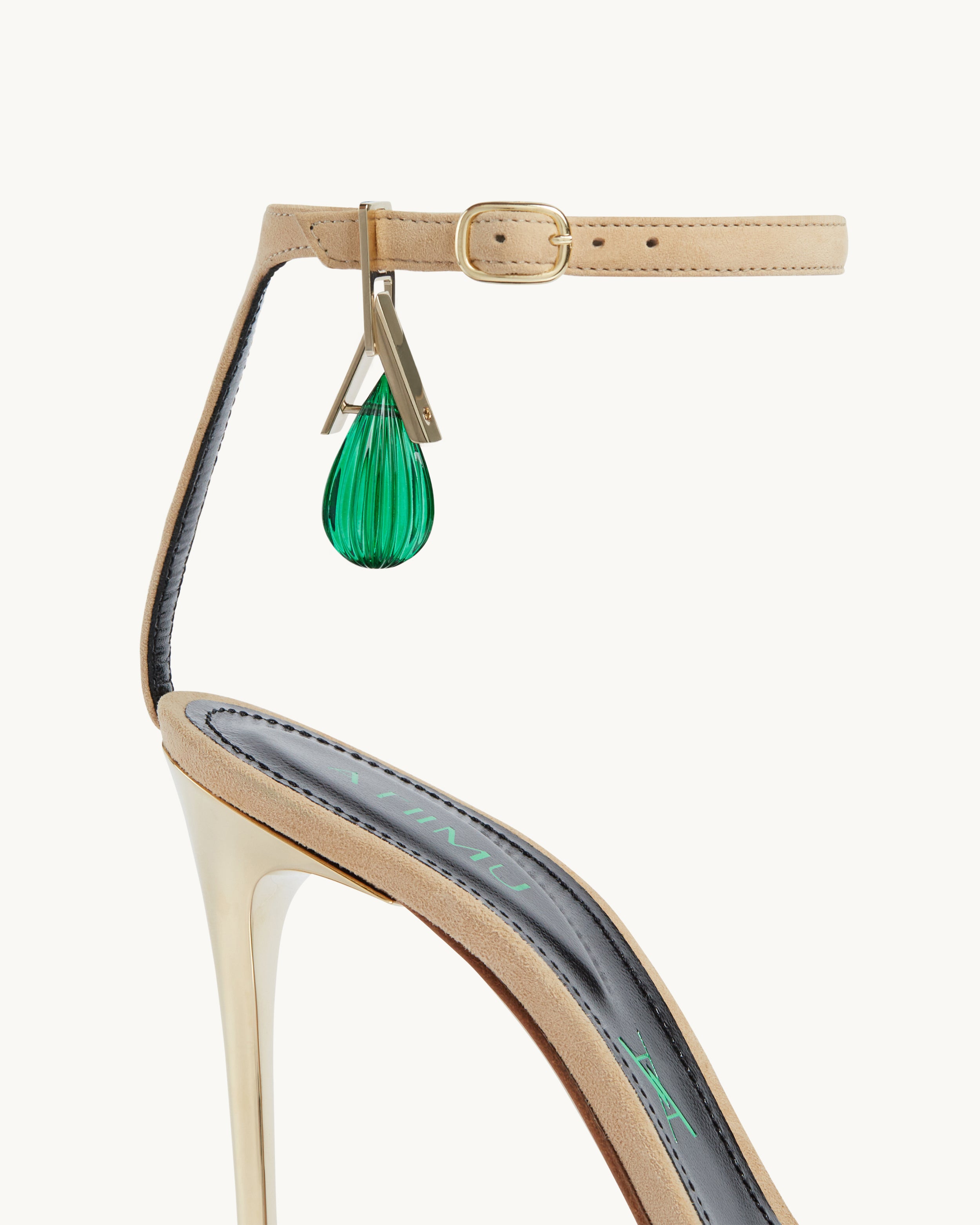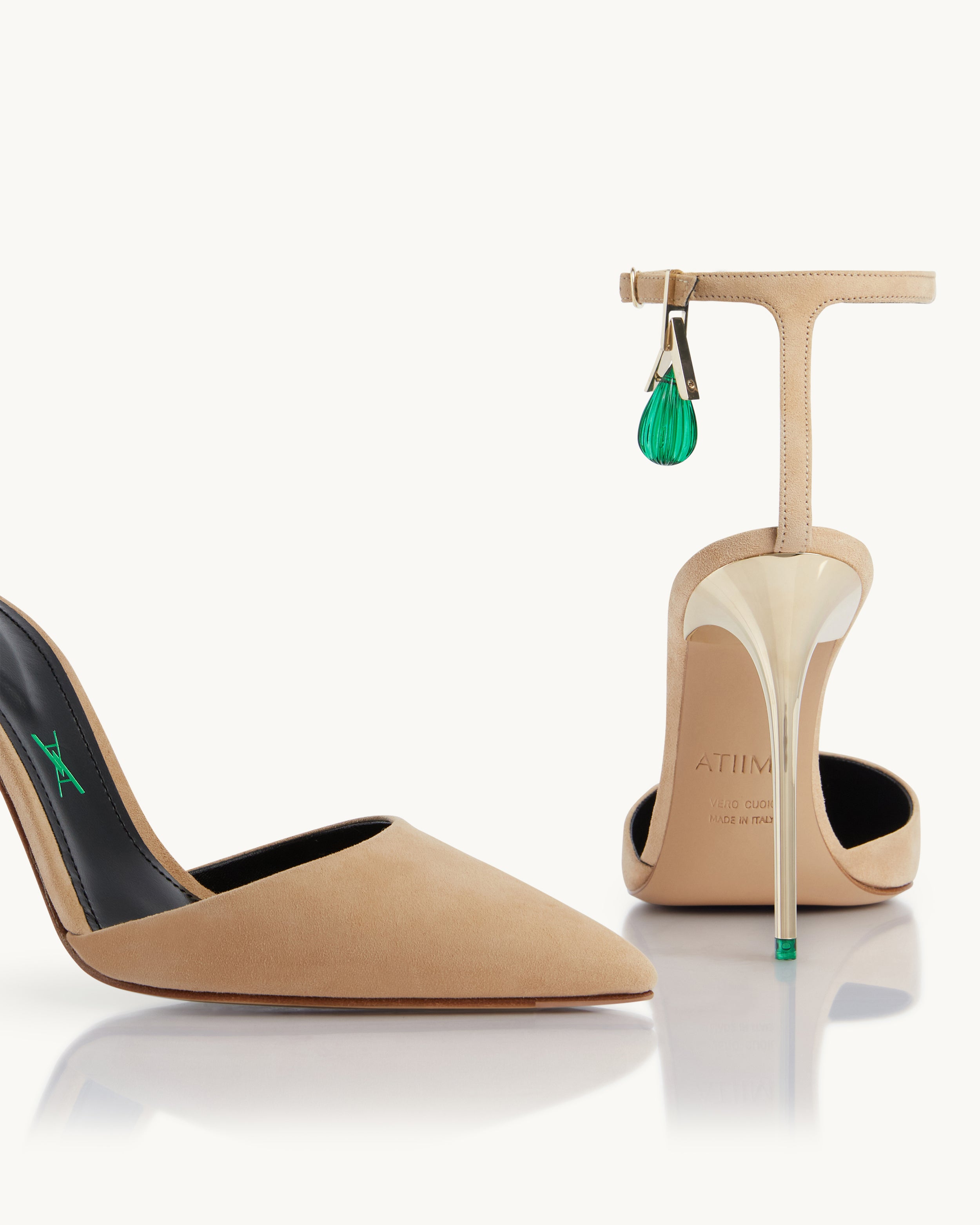 ATIIMU’s first collection of shoes for women captures the enigma and edge of Moussi’s style. Inspired by emeralds, light, architecture, and jewelry, the collection explores timeless heels in flashy leather, slender straps, and directional shapes. Each is adorned by the SPARK, a mesmerizing gemstone that has come to be a design code of the house.