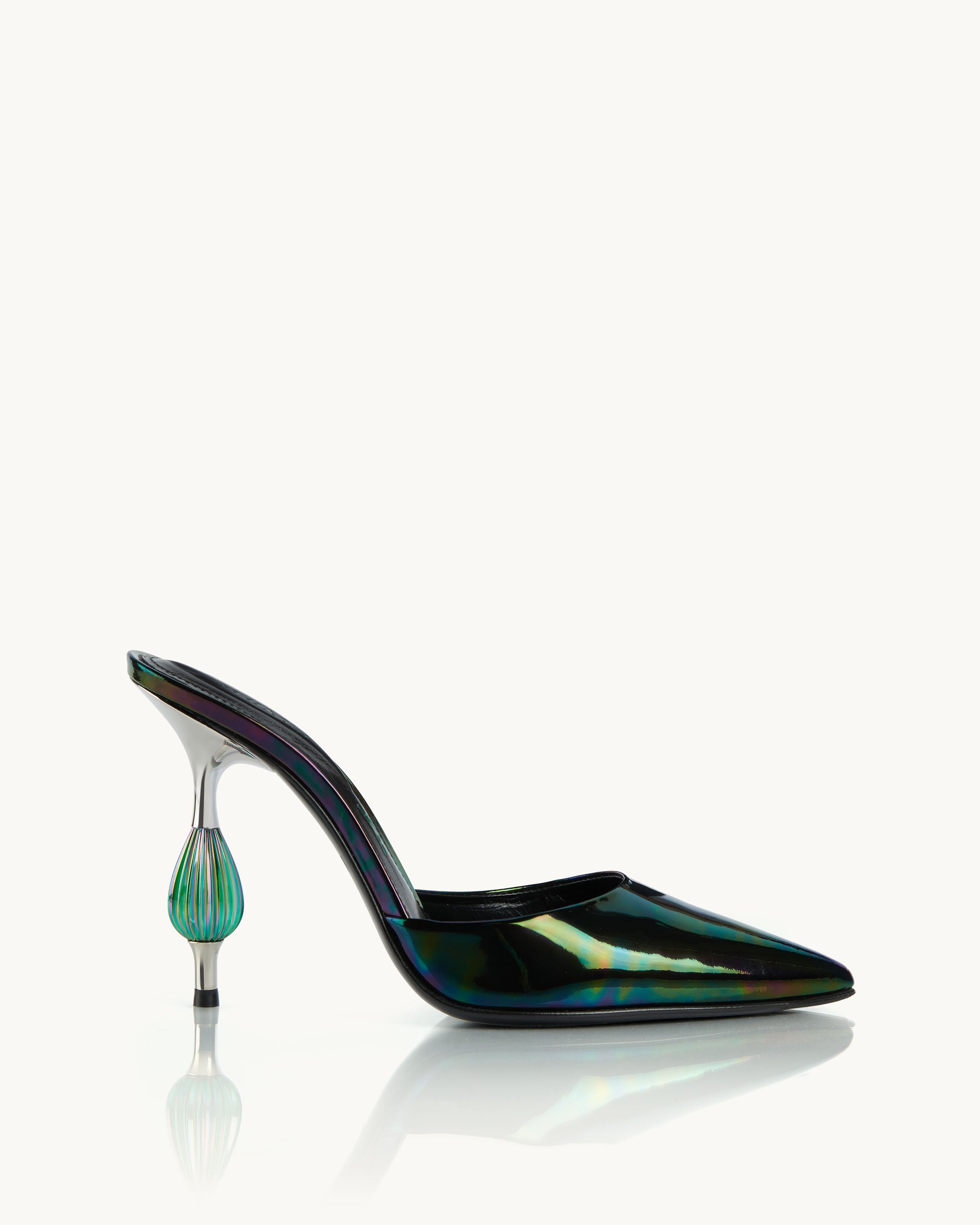 ATIIMU’s first collection of shoes for women captures the enigma and edge of Moussi’s style. Inspired by emeralds, light, architecture, and jewelry, the collection explores timeless heels in flashy leather, slender straps, and directional shapes. Each is adorned by the SPARK, a mesmerizing gemstone that has come to be a design code of the house.