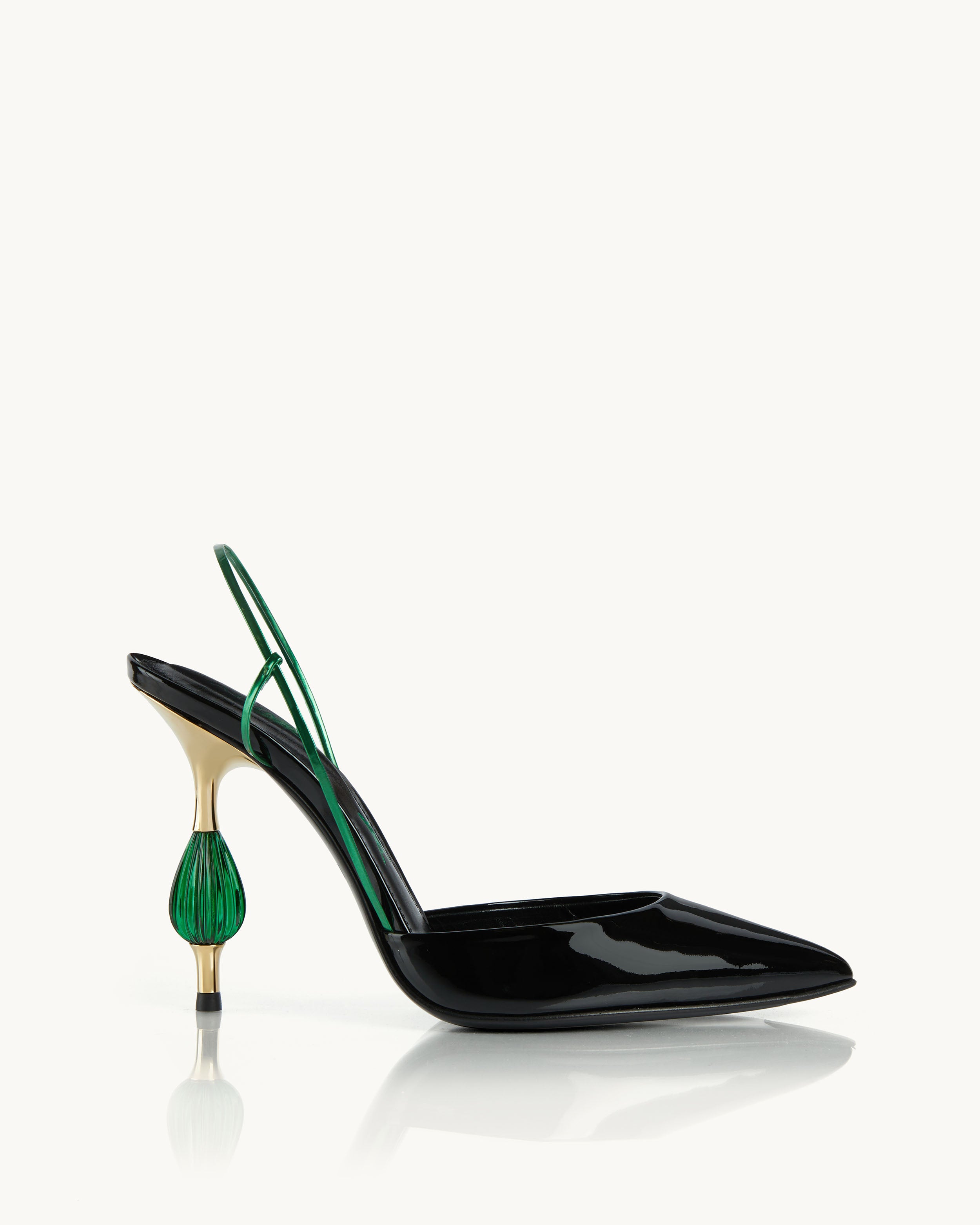 ATIIMU uses architectural technology to create futuristic classics like the ZIIMU. Crafted in Italy, these patent leather pumps frame the foot with a pointed toe and slender slingback strap. They are set on ATIIMU’s signature gemstone heel for a lustrous finish.