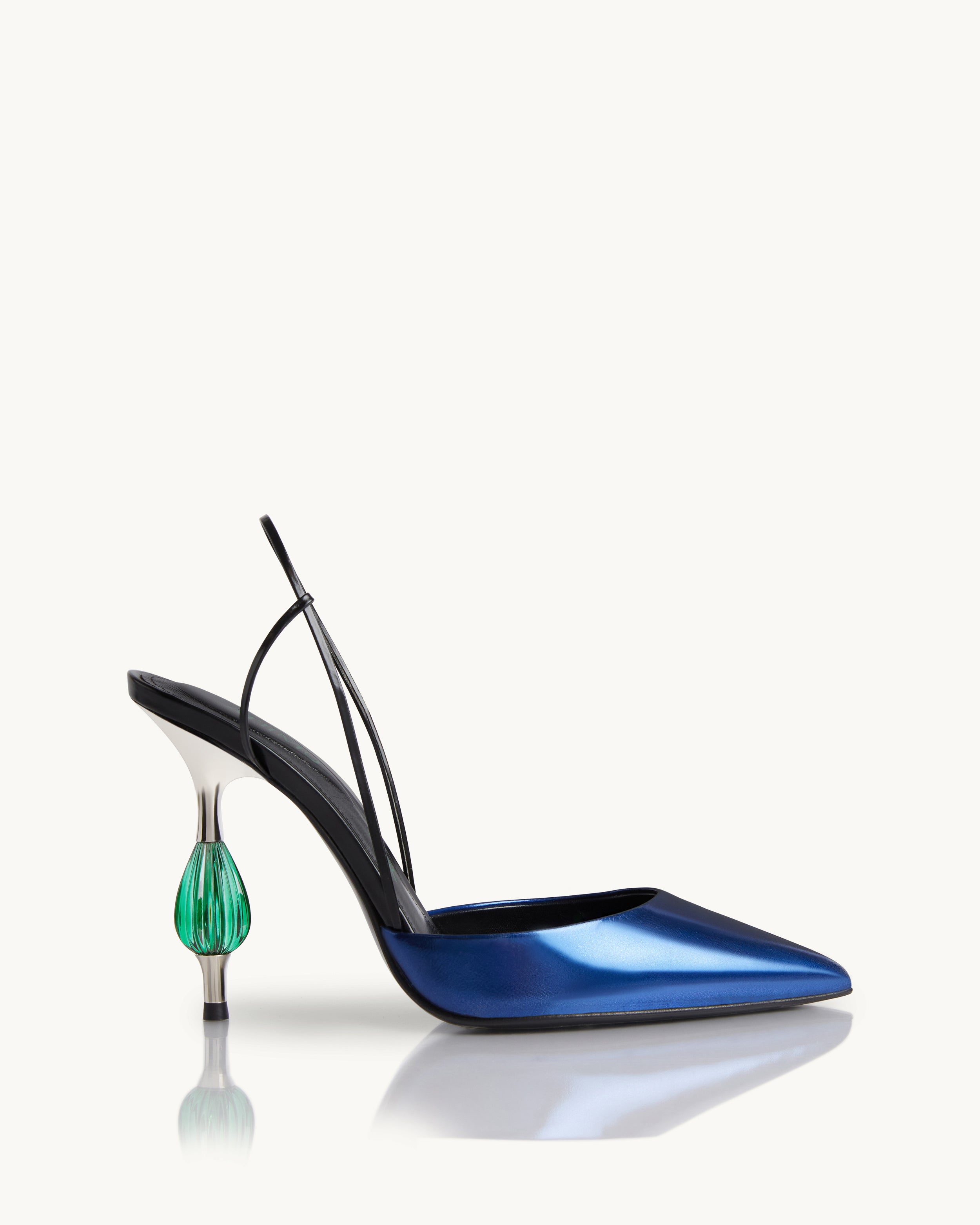 ZIIMU holds a starlight quality that simply shines in evening parties. Assembled in Italy from mirrored blue leather, this style is a glamorous take on the slingback pump. It is poised on a pointed toe and ATIIMU's emerald gemstone heel for an elegant pop of color.
