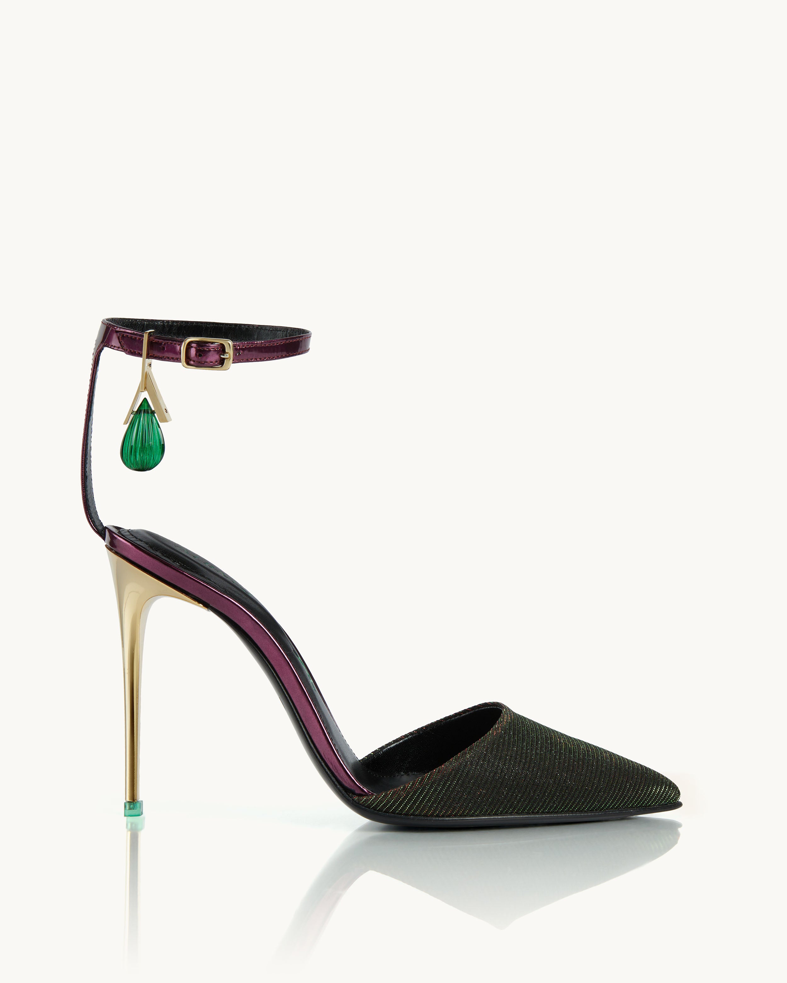 ATIIMU’s first collection of shoes for women captures the enigma and edge of Moussi’s style. Inspired by emeralds, light, architecture, and jewelry, the collection explores timeless heels in flashy leather, slender straps, and directional shapes. Each is adorned by the SPARK, a mesmerizing gemstone that has come to be a design code of the house.